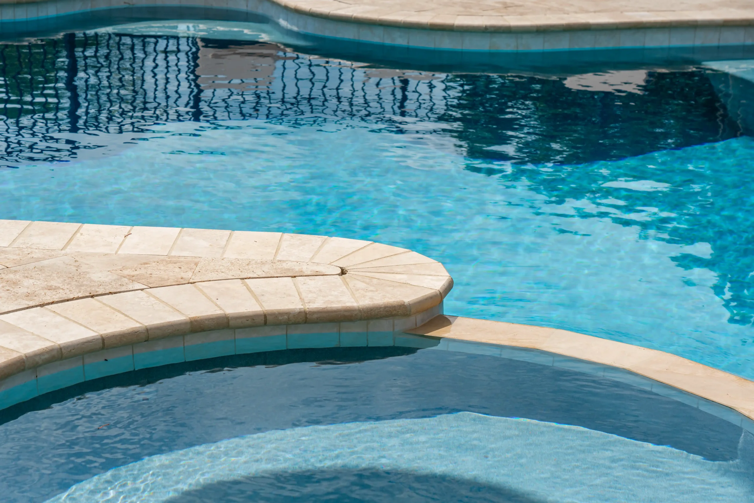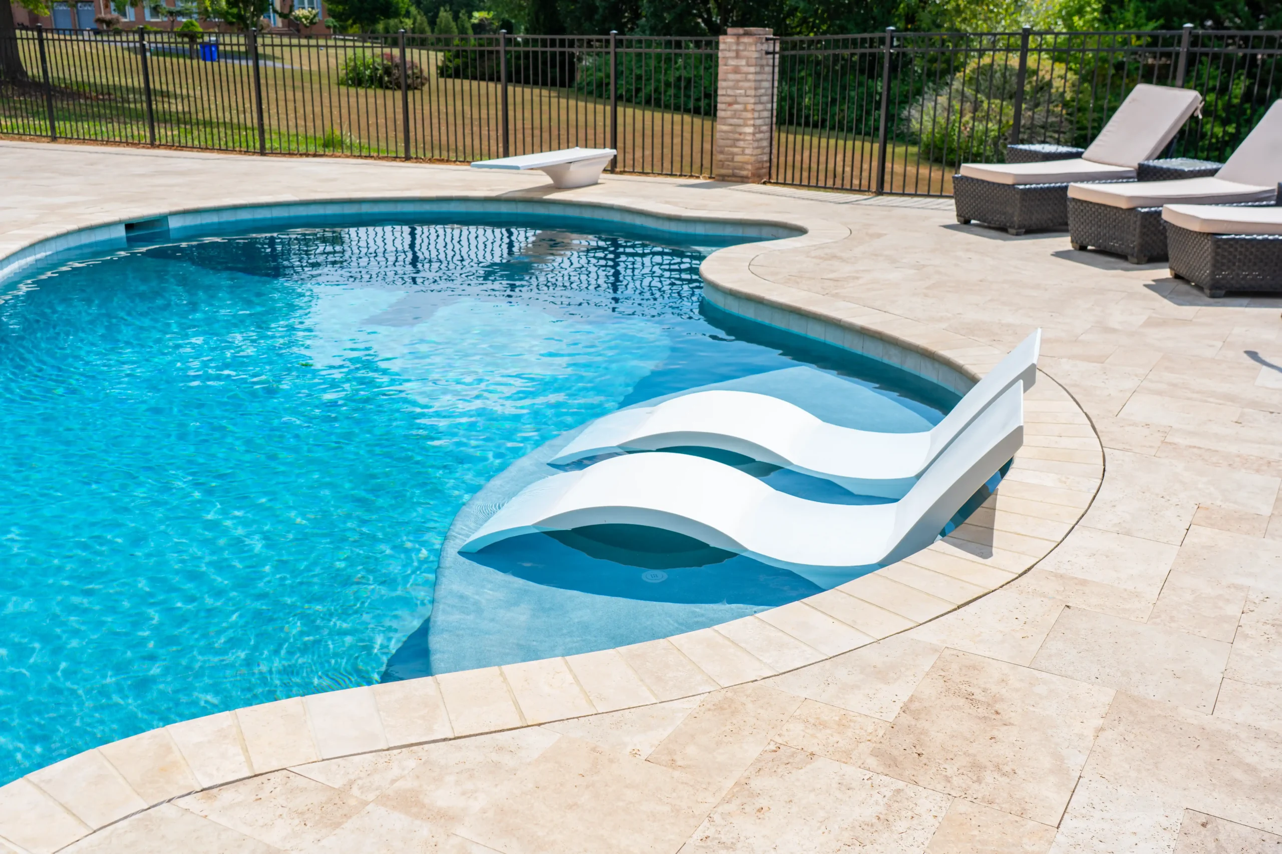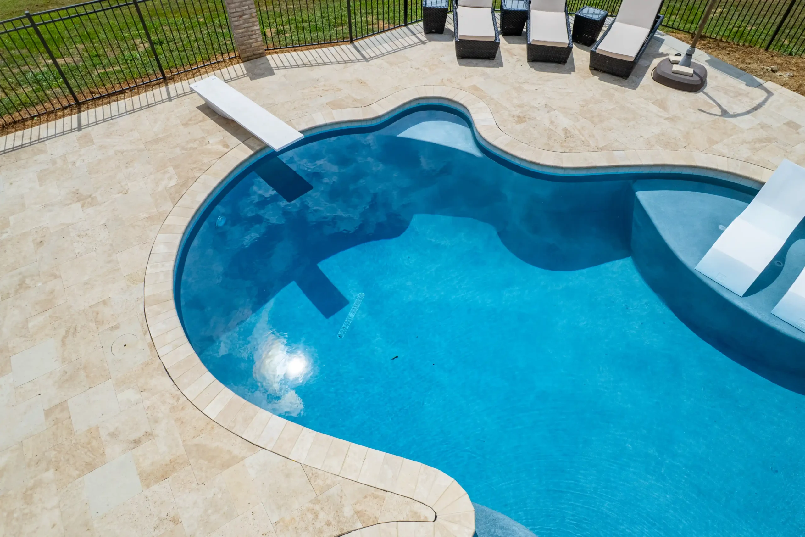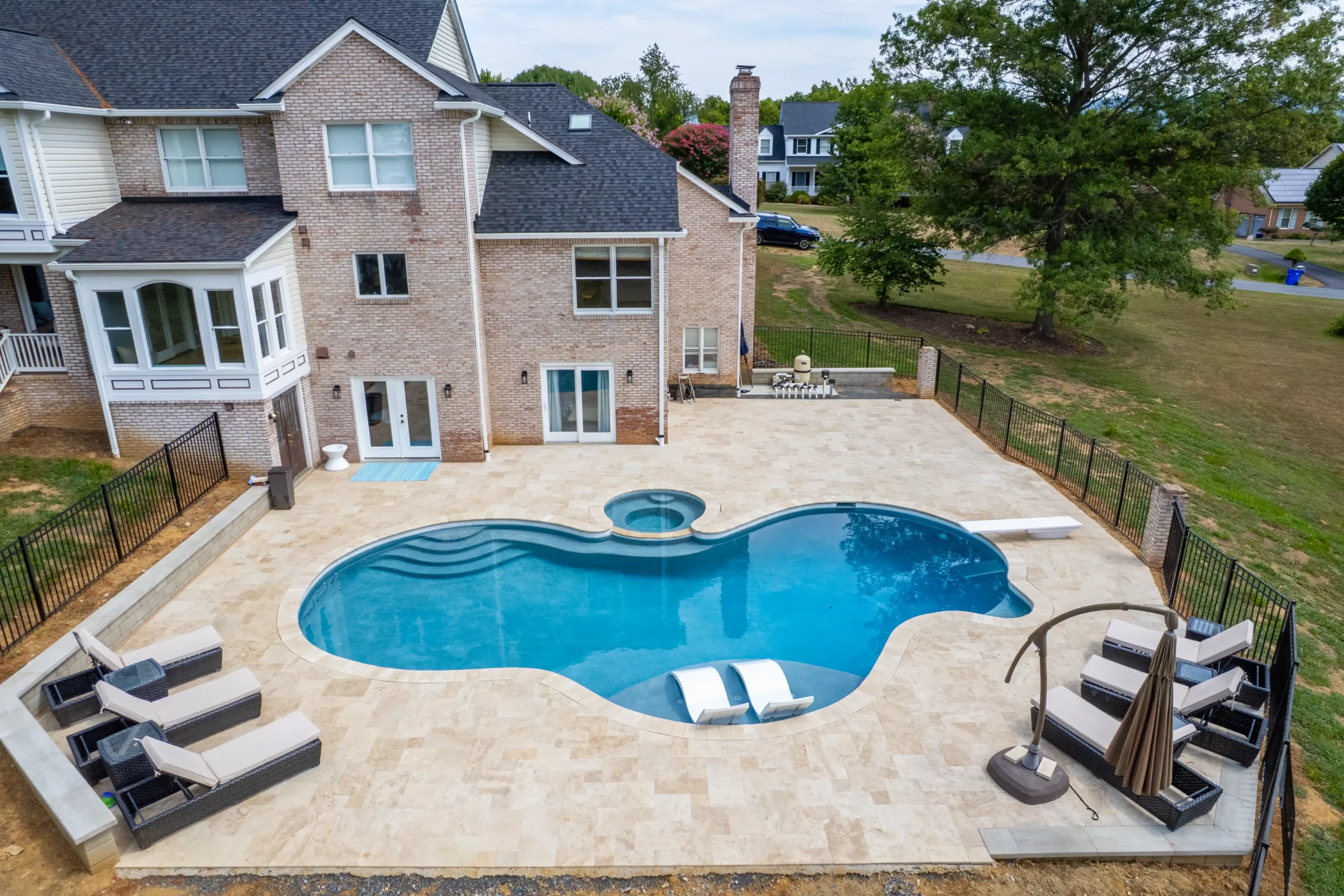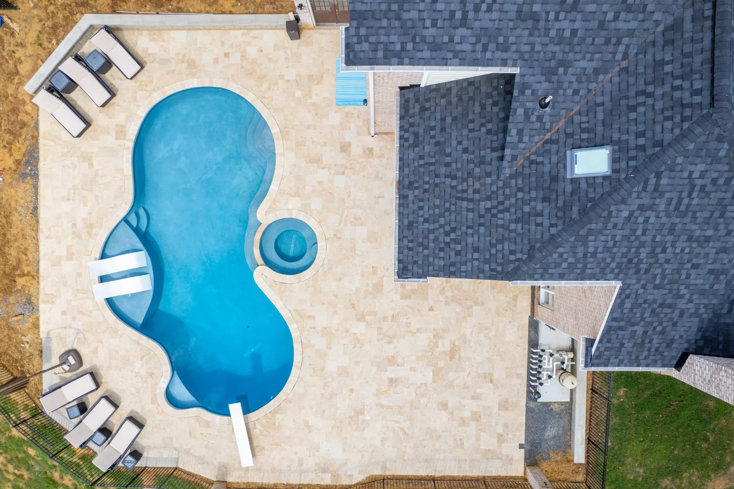 Traditional rectangle pool with raised stone face bond beam and 6-foot waterfall.