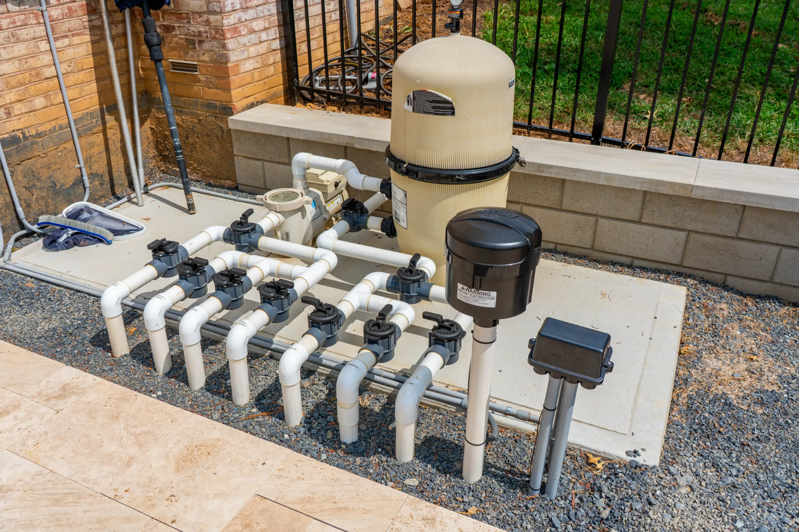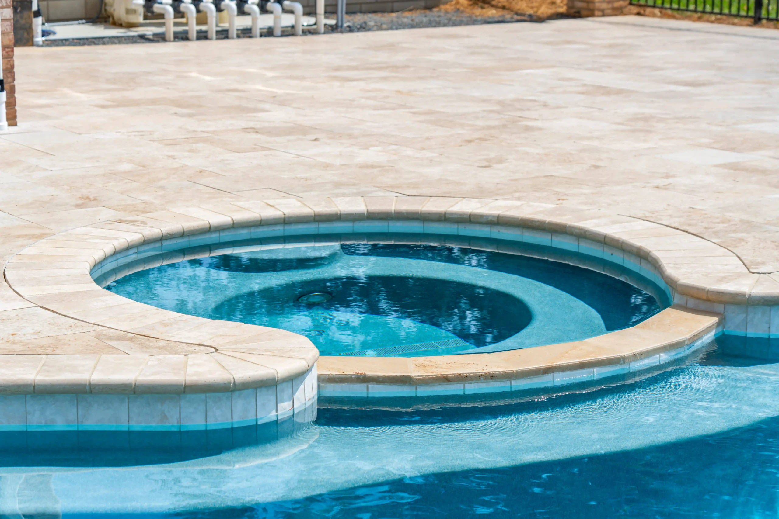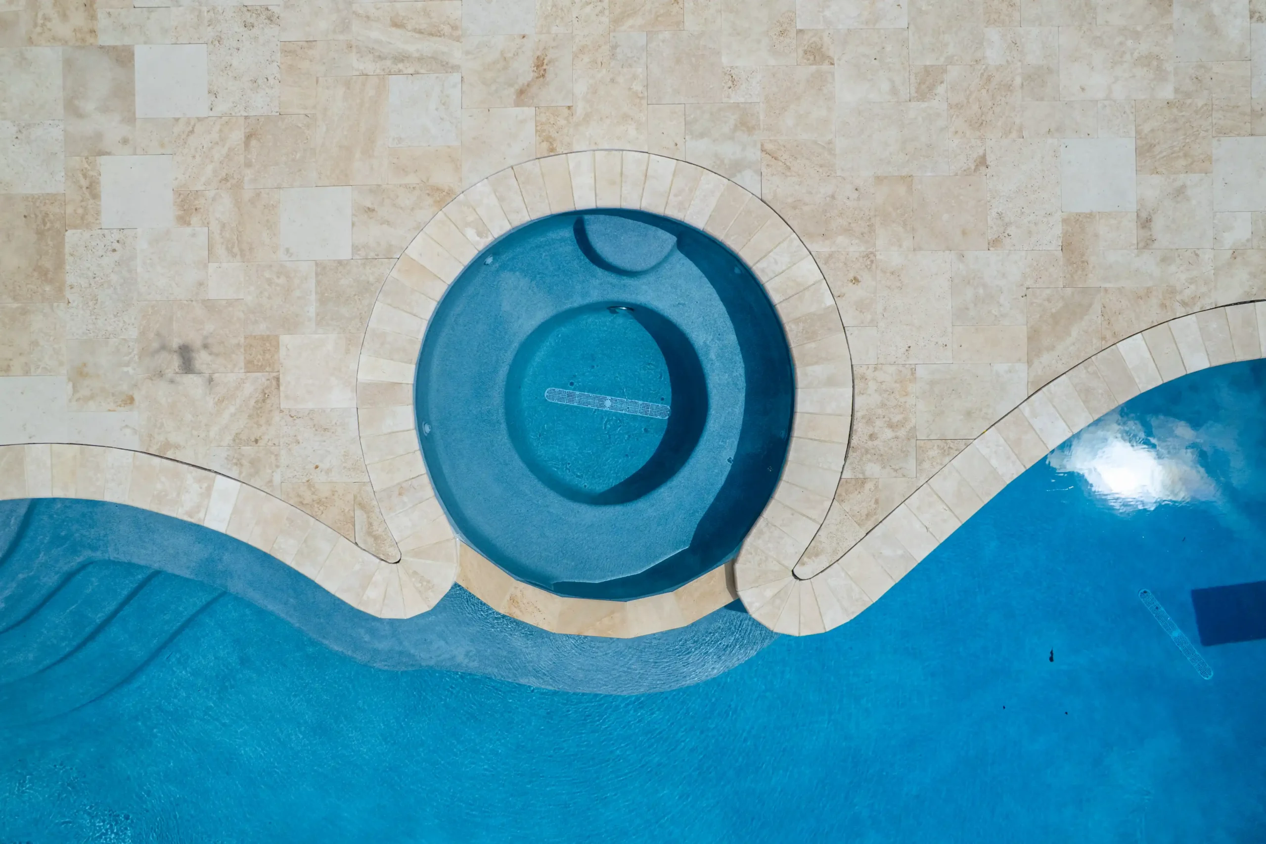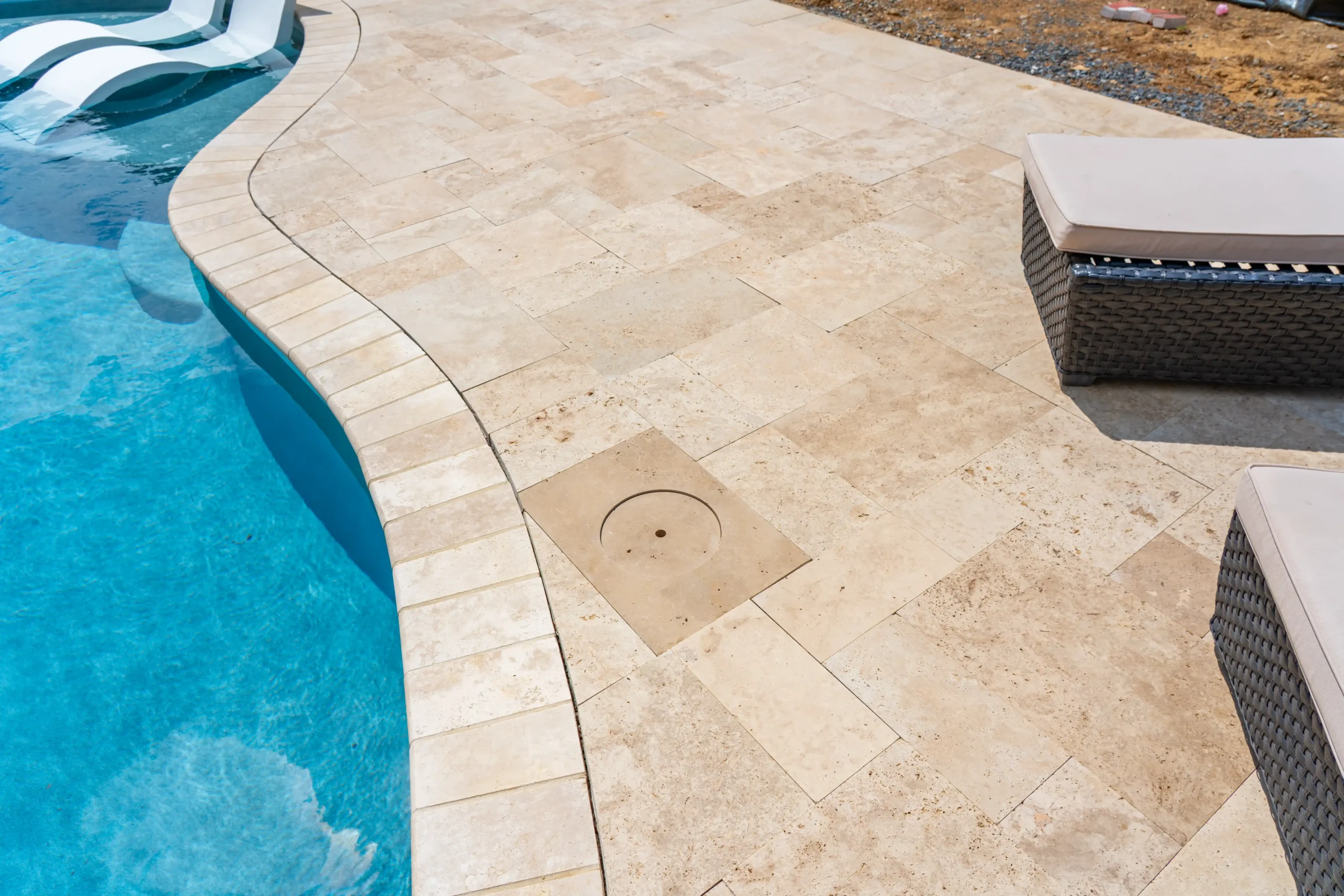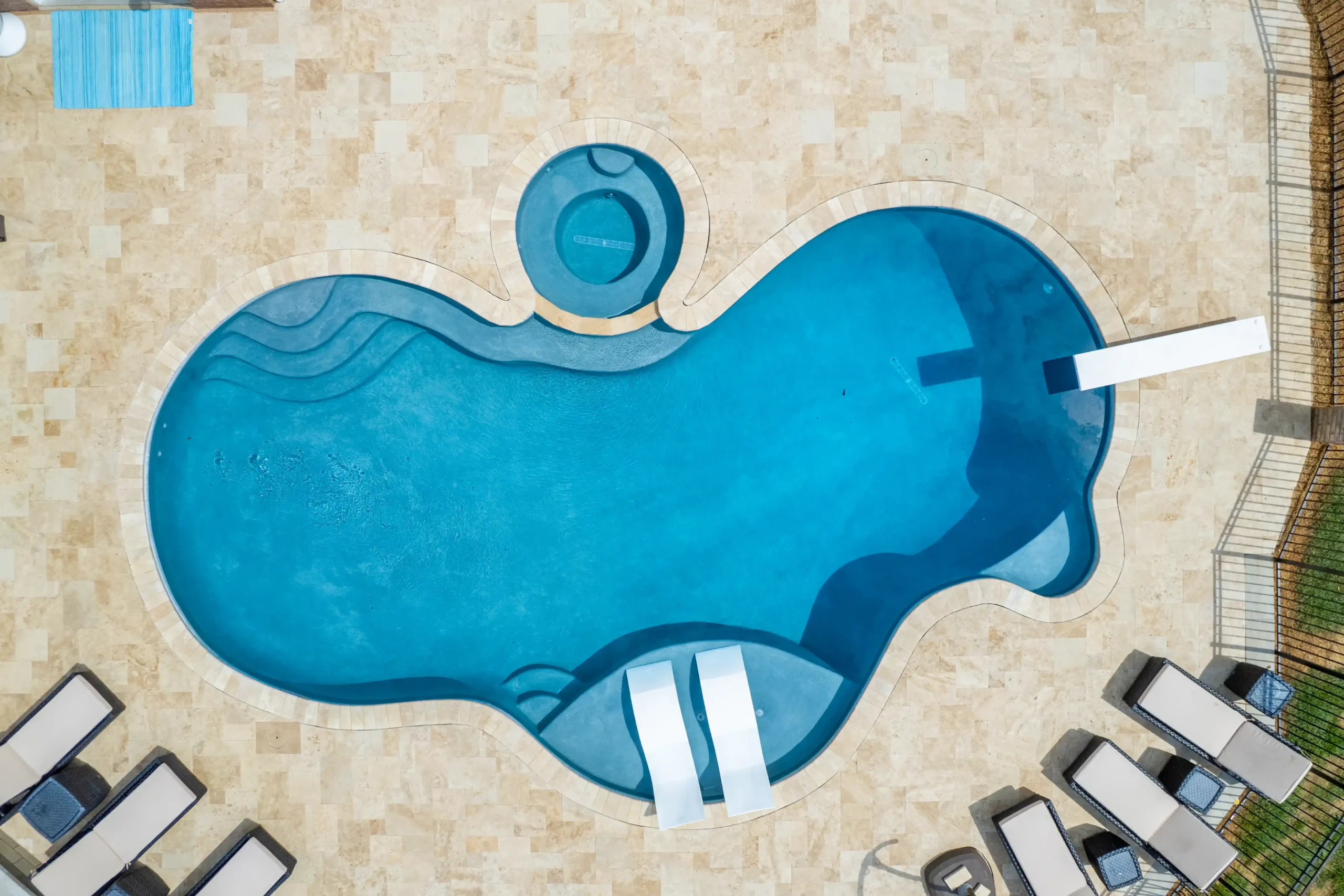 Traditional rectangle pool with raised stone face bond beam and 6-foot waterfall.
